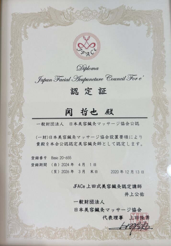当院は一般財団法人日本美容鍼灸マッサージ協会から認定を受けた専門の美容鍼灸師が常駐しております。